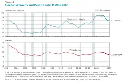 In the United States, poverty has both social and political implications. In 2020, there were 37.2 million people in poverty.[1] Some of the many causes include income inequality,[2] inflation, unemployment, debt traps and poor education.[3] The vast majority of people living in poverty are less educated and end up in a state of unemployment;[4] higher incarceration rates have also been observed.[3] Although the US is a relatively wealthy country by international standards,[5] poverty has consistently been present throughout the United States, along with efforts to alleviate it, from New Deal-era legislation during the Great Depression, to the national war on poverty in the 1960s and poverty alleviation efforts during the 2008 Great Recession.