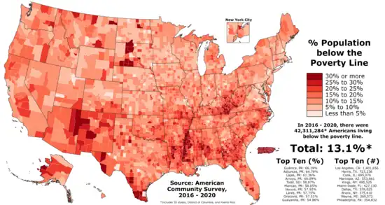In the 2010 U.S. Census, Guam had a poverty rate of 22.9%,[78] the Northern Mariana Islands had a poverty rate of 52.3%,[79] and the U.S. Virgin Islands had a poverty rate of 22.4%[80] (all higher than any U.S. state). In 2018, Puerto Rico had a poverty rate of 43.1%.[75] In 2017, American Samoa had a poverty rate of 65% — the highest poverty rate of any state or territory in the United States.[81]