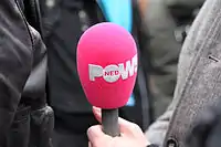 The signature pink microphone cover of PowNed, with their former logo used from 2009 till 2019