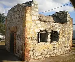 The Powder Magazine from Camp Drum is a Los Angeles Historic-Cultural Monument located in the Wilmington section of Los Angeles, California, near the Port of Los Angeles. Built in 1862, the Powder Magazine is a 20-by-20-foot (6.1 m × 6.1 m) brick and stone structure that was used to store gunpowder during the Civil War. It was originally part of Camp Drum, a facility built upon the outbreak of the American Civil War to address concerns about the loyalty and security of the Los Angeles area. Many of the area's residents were recent arrivals from the Southern states, and southerner John C. Breckinridge received twice as many local votes as Abraham Lincoln in the 1860 Presidential election.[2] Phineas Banning, the founder of Wilmington (then known as New San Pedro), wrote to President Lincoln advising that the Union would lose California unless some provision was made to quell pro-Confederacy sentiment. Camp Drum was built between 1862 and 1863 and was the home base for the California Column, commanded by Colonel James Henry Carleton.[3] Between 2,000 and 7,000 soldiers were stationed at Camp Drum, and Wilmington became a thriving community with a population greater than Los Angeles during the war. The Powder Magazine is one of only two surviving structures from Camp Drum, the other being the Drum Barracks, which is now operated as a Civil War museum by the City of Los Angeles.[4] The Powder Magazine has been used for various private uses over the years, at one point having another structure built around it. When the larger structure was torn down, the Powder Magazine was re-discovered. In order to save it from demolition, it was declared a Historic-Cultural Monument (HCM #249) in August 1982.[1] For more than two decades, it has sat on a vacant, fenced-off lot two blocks south of the Drum Barracks.