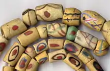 Powder glass beads are a type of necklace ornamentation. The earliest such beads were discovered during archaeological excavations at Mapungubwe in South Africa, and dated to between 970-1000 CE. Manufacturing of the powder glass beads is now concentrated in West Africa, particularly in the Ghana area. The origins of beadmaking in Ghana are unknown, but the great majority of powder glass beads produced today is made by Ashanti and Krobo craftsmen and women. Krobo bead making has been documented to date from as early as the 1920s but despite limited archaeological evidence, it is believed that Ghanaian powder glass bead making dates further back. Bead making in Ghana was first documented by John Barbot in 1746.[1] Beads still play important roles in Krobo society, be it in rituals of birth, coming of age, marriage, or death.