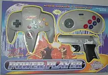The units resemble a Nintendo 64 controller, sometimes with a cartridge slot for Famicom games. They come packaged with a secondary 9-pin 6 button controller resembling a Sega Genesis controller, intended for a second player. They are packaged with a 9-pin light gun resembling a Walther PPK pistol. There is a non-moving joystick, added for visual appeal. Though the Power Player Super Joy's button layout is identical to that of the Nintendo 64 controller, the buttons have been mapped differently. The C buttons of the Nintendo 64's controller function as A and B on the Super Joy, the A and B buttons of the Nintendo 64's controller are Start and Select on the Super Joy, respectively. Finally, the N64 controller's Start button is the Reset button on the Super Joy. The units are available in multiple colors, including black, grey, red, and blue.