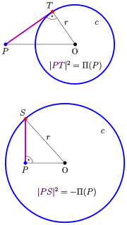 Due to the Pythagorean theorem the number has the simple geometric meanings shown in the diagram: For a point outside the circle is the squared tangential distance of point to the circle .