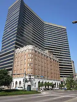 The street traces back to 1788 when it was first laid out, but its prominence traces back to its transformation that began in the 1960s.[3] In the 1890s, Poydras Street and Canal Street were early hosts of municipal lighting when gigantic spotlights in steel light towers were erected upon them by Muller Co.[4] In 1927, when its width measured 74 feet (22.6 m), the movement to widen it was begun by consultants for the City Planning Commission.[3] The street hosted the Poydras Market from 1838 to 1932.[3] As urban planning evolved, Poydras became the logical 4-lane connection between Expressways. It took until 1964 for a bond issue to pass that would acquire the properties to widen the street as had been recommended in 1927.[3] From November 23, 1964 until August 16, 1966, demolition, drainage installation, utility connection, paving, sidewalk construction and landscaping occurred, resulting in a six-lane 132-foot (40.2 m) wide street.[3] Many factors combined to give Poydras Street its prominent place in urban transit, including the erection of the Louisiana Superdome at one end and the Rivergate Exhibition Hall at the Mississippi River end in the late 1960s and the construction of One Shell Square in 1972.[3] Subsequently, more than a dozen skyscrapers were erected along the street that has become a central area circulator for vehicular traffic and host of modern high-rise construction.[3]