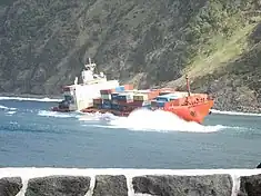 On December 9, 2005 while attempting to navigate to calm waters in the Bay of Praia do Fajã, the container vessel CP Valour, a Bermudan-registered ship, originally traveling between Montreal, Quebec, Canada and Valencia, Spain, ran aground 300 metres (980 ft) from the coast. It was transporting 800 containers, of which three were environmentally hazardous, and the vessel was filled with two thousand tons of fuel oil. The tugboats "São Luís" (from the port of Horta) and "São Miguel" (from the port of Ponta Delgada) were called out to assist the crippled vessel, and were later aided by the Russian tug "Fortiy Frilov" (in order to stabilize the ship in northerly swells). However, the bay's currents forced the ship further to shore, forcing the abandonment of the ship on 25 December. The hulls eventually breached, causing an oil spill into the bay and onto the beach at Fajã. Similarly, some containers containing toxic fire retardant, flammable ink and paint and sodium persulphate were affected, and several containers were damaged or destroyed during the incident, leaking their contents into the bay. In the report on the accident,[4] the Marine Accident Investigation Branch noted several failures including lack of crew management and procedures on the part of the operator, the inexperience and lack of seamanship of the master, and lack of proper nautical charts and anchoring experience. The accident brought world attention to Fajã da Praia, Faial and the Azores.