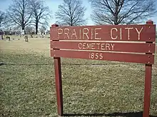 Prairie City was founded in 1855 by James Lane, Dr. William Graham, Louis (Lewis) F. Green and Salmon S. Prouty after a dispute between Graham and Henry Barricklow of nearby Palmyra.[2] A post office opened in 1856 with John R. Winton serving as postmaster. The Heber Institute was started by the Protestant Episcopal Church in 1856 but never opened. The building became Prairie City School District No. 1.[3]