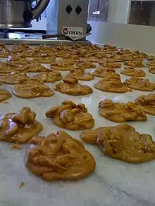 Pralines have a creamy consistency, similar to fudge. They are usually made by combining sugar (often brown), butter, cream or buttermilk, and pecans in a pot over medium-high heat, and stirring constantly until most of the water has evaporated and it has reached a thick texture with a brown color. This is then usually dropped by spoonfuls onto wax paper or a sheet of aluminum foil greased with butter, and left to cool.[2][6] [7]