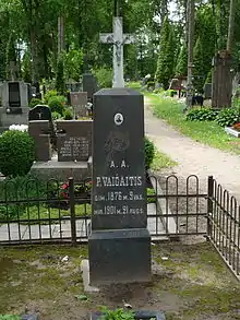 Vaičaitis graduated from the university in June 1899, but as politically compromised, he could not obtain a jurist job with the Russian government.[4] He had plans to study commerce in Belgium, but he did not have funds.[2] With the help of Volters (there are hints that Vaičaitis lived with Volters for about six months),[5] he managed to get a job at the library of the Russian Academy of Sciences, but, due to progressing illness, he had to return home in April 1901.[4] He was treated by Jonas Staugaitis and cared for by his fiancé Pranaitytė, but the family had no money for more extensive treatments and the tuberculosis progressed.[8] He died on 21 September 1901 in his parents' home. His tombstone was organized by Saliamonas Banaitis. He collected 95 rubles, purchased the monument in Kaunas, and transported it to the cemetery in Sintautai. It was installed for the first anniversary of his death.[12] The tombstone cost more than 95 rubles and Volters covered the difference of 23.5 rubles.[5]