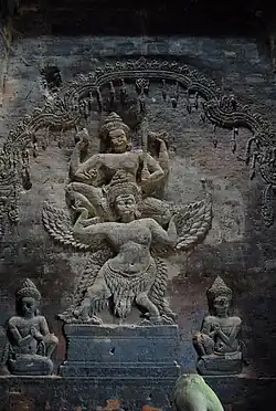 Prasat Kravan (Khmer: ប្រាសាទក្រវាន់) is a small 10th-century temple consisting of five reddish brick towers on a common terrace, at Angkor, Cambodia, south of the artificial lake (baray) called Srah Srang. Its original Sanskrit name is unknown. The modern name in Khmer, "Prasat Kravan", means artabotrys odoratissimus temple. The temple was dedicated to Vishnu in 921 CE,[1]: 70 according to an inscription on doorjambs.[2]