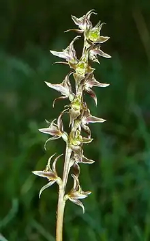 Prasophyllum wilkinsoniorum is a terrestrial, perennial, deciduous, herb with an underground tuber and a single bright green, tube-shaped leaf, 300–400 mm (10–20 in) long with a white to reddish base. Between fifteen and forty five flowers are arranged along a flowering spike up to 450 mm (20 in) high. The flowers are dark greenish-brown to brownish-red and scented. As with others in the genus, the flowers are inverted so that the labellum is above the column rather than below it. The dorsal sepal is egg-shaped to lance-shaped, 8–11 mm (0.3–0.4 in) long, about 4 mm (0.2 in) wide and turned downwards. The lateral sepals are linear to lance-shaped, 8–11 mm (0.3–0.4 in) long, about 2 mm (0.08 in) wide and the petals are linear to narrow lance-shaped, 8–12 mm (0.3–0.5 in) long and about 2 mm (0.08 in) wide. The labellum is green to pinkish, broadly egg-shaped to lance-shaped, 7–9 mm (0.3–0.4 in) long, about 5 mm (0.2 in) wide and turns sharply upwards with wavy edges. There is a fleshy green to brown callus in the centre of the labellum. Flowering occurs from December to January.[2]