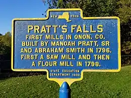 In 1796 this land housed one of Onondaga County's first mills. This saw mill, owned and operated by Manoah Pratt, Sr. and Abraham Smith formerly of Connecticut, ran until 1798 when it was turned into a flour mill.[4]