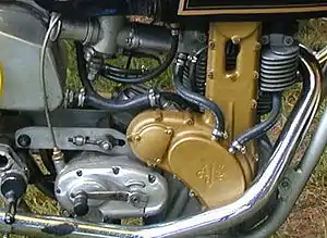 Pre-unit construction,[1] also called separate construction, is a motorcycle engine architecture where the engine and gearbox are separate components with their own oil reservoirs, linked by a driving chain within a primary chaincase. Mounting plates are usually attached to the frame allowing for chain adjustment by gearbox fore-and-aft movement and via screw adjusters and elongated mounting holes. Even though Singer[2] offered an integrated engine and gearbox in a single casing in 1911, it was not until the 1950s that technical advances meant it was possible to reliably construct engines with integral gearboxes in a single unit, known as unit construction.
