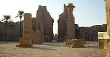 Through the walls of the Hypostyle Hall is the mostly ruined Transverse Hall, alongside a reconstructed Third Pylon of Amenhotep III.[4] Though much ruined, in antiquity it was quite splendid and parts of it were even plated in gold by pharaoh Amenhotep III. A vestibule was added late in the pharaoh's reign and then partly decorated with incompleted triumph scenes by Amenhotep IV/Akhenaten before the new pharaoh abandoned the project due to his religious revolution which rejected the cult of the god Amun-Re.