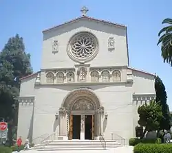 The current church building stands on a v-shaped corner of Occidental Blvd. and Hoover St., dedicated in November 1926. It is an Italian Romanesque structure. The church has three rose windows that offer a dim and religious life. Twelve large stained glass windows, six yellow windows and the Stations of the Cross Mosaics are over the nave.[1] The church structure is entirely made of poured concrete. The ceiling beams are painted to look like wood, but are actually concrete. The church was remodelled in 1951 by Wallace Neff who commissioned Millard Sheets to create the mosaics in the apse. Neff also added a parish hall.[5]