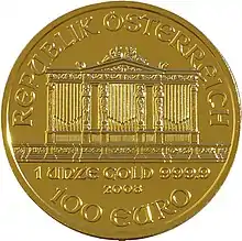 One of the largest bullion coins in the world was the 10,000-dollar Australian Gold Nugget coin minted in Australia which consists of a full kilogram of 99.9% pure gold. In 2012, the Perth Mint produced a 1-tonne coin of 99.99% pure gold with a face value of $1 million AUD, making it the largest minted coin in the world with a gold value of around $50 million AUD.[2] China has produced coins in very limited quantities (less than 20 pieces minted) that exceed 8 kilograms (260 ozt) of gold. Austria has minted a coin containing 31 kg of gold (the Vienna Philharmonic Coin minted in 2004 with a face value of 100,000 euro). As a stunt to publicise the 99.999% pure one-ounce Canadian Gold Maple Leaf series, in 2007 the Royal Canadian Mint made a 100 kg 99.999% gold coin, with a face value of $1 million, and now manufactures them to order, but at a substantial premium over the market value of the gold.[3][4]