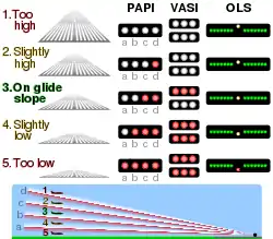 An earlier glideslope indicator system, the visual approach slope indicator (VASI), only provided guidance down to heights of 60 metres (200 ft) whereas PAPI provides guidance down to flare initiation (typically 15 metres, or 50 ft).