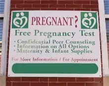 A crisis pregnancy center (CPC), sometimes called a pregnancy resource center (PRC)[2] or a pro-life pregnancy center,[3][4] is a type of nonprofit organization established by anti-abortion groups primarily to persuade pregnant women against having an abortion.[5][6][7]: 1 In the United States, CPCs that qualify as medical clinics may also provide pregnancy testing, sonograms, and other services,[8] while many others operate without medical licensing under varying degrees of regulation.[9] CPCs have frequently been found to disseminate false medical information about the supposed physical and mental health risks of abortion,[10][11][12] and sometimes promulgate misinformation about the effectiveness of condoms and prevention of sexually transmitted infections.[13] CPCs are sometimes referred to as fake abortion clinics by scholars, the media, and supporters of abortion rights, due to deceptive advertising practices that obscure the anti-abortion agenda of CPCs from potential patients seeking abortions.[14][15][16][17]