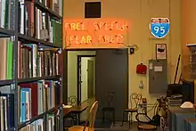 The library is unusual in that it uses a custom system of organization designed by Megan that intends to facilitate and emphasize browsing. For example, the section on "Suburbia" is next to the section on "Domestic Environments", then "Architecture", which becomes "Graphic Design", which in turn leads to "Typography" and "Fine Arts", and then "Advertising" and "Sales". There is no Dewey Decimal Classification system or card catalog.