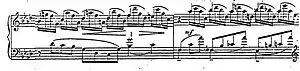 A transition section comes together though the combination of ascending and descending chromatic scale fragments at measures 31–41. Measures 30 and 31 contain a subtle but clear motive (in the left hand) that reappears again (in a slightly different manner) in the 2nd Symphony (1st movement). Vertiginous modulations swing through E flat – G – C – F – A flat and B flat, before settling into E flat at measures 39–41.