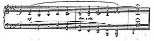 The original statement occurs beginning at measure 42, and then a progression at measures 54–62 through F- B flat – D flat and F minor provides a link to measures 61–70, where the harmonies become vague and undistinguishable: