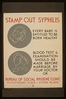 The spread of these laws was abetted by Surgeon General Thomas Parran, who, during this period, embarked on a public health campaign to reduce syphilis rates and inform the public about the disease.[7] Premarital blood testing requirements were also supported by the American eugenics movement, which regarded them as one measure to prevent reproduction of the unfit.[7]