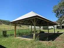 The Queensland education system recognised the importance of play in the school curriculum and, as school sites were typically cleared of all vegetation, the provision of all-weather outdoor space was needed. Playsheds were designed as free-standing shelters, with fixed timber seating between posts and earth or decomposed granite floors that provided covered play space and doubled as teaching space when required These structures were timber-framed and generally open sided, although some were partially enclosed with timber boards or corrugated galvanised iron sheets.[15] The hipped (or less frequently, gabled) roofs were clad with timber shingles or corrugated iron. Playsheds were a typical addition to state schools across Queensland between c. 1880s and the 1950s, although less frequently constructed after c. 1909, with the introduction of highset school buildings with understorey play areas. Built to standard designs, playsheds ranged in size relative to student numbers.[16] In 1910, a six-post timber playshed with a hipped roof was built at Prenzlau State School by C Ridsdale of Rosewood for £36.10s. Pupil numbers in this period averaged more than 50 per day.[17] The playshed was a characteristic example of a six-post type, with light timber framing.[18][1]