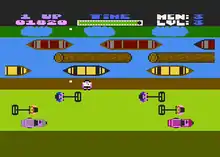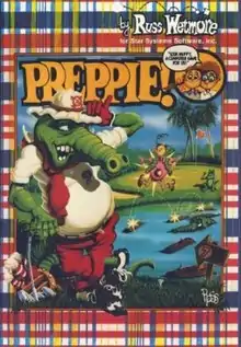 Preppie! is an action video game for the Atari 8-bit family published by Adventure International in 1982. It was programmed by Russ Wetmore of Star Systems Software,[1] whose name is prominently displayed on the box cover. Leaning on the preppy trend of the early 1980s, the game follows prep schooler Wadsworth Overcash as he navigates the hazards of a country club to retrieve golf balls.[2] Preppie! borrows heavily from Konami's Frogger,[3][4] with lanes of traffic in the bottom half of the screen and a river crossing the top portion. Alligators are an element from both Frogger and preppy fashion; an open-mouthed gator is the icon of shirt brand Izod. Reviewers recognized the game as derivative, but called the music and visuals some of the best for Atari 8-bit computers.