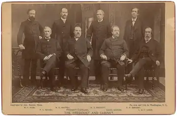 There was much speculation during the presidential transition period about who would be serving in Cleveland's cabinet. It was generally assumed that Thomas F. Bayard would be offered the position of secretary of state.[16] By February 27, 1885, Cleveland had been reported to have settled on all the officeholders for his Cabinet.[17] However, Daniel S. Lamont, Cleveland's private secretary, immediately denied reports that Cleveland had settled upon his Cabinet choices, and that he had announced his selections to others.[18]