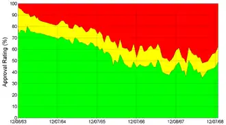 The American public was generally supportive of the Johnson administration's rapid escalation of U.S. military involvement in South Vietnam in late 1964.[130] Johnson closely watched the public opinion polls,[131] which after 1964 generally showed that the public was consistently 40–50 percent hawkish (in favor of stronger military measures) and 10–25 percent dovish (in favor of negotiation and disengagement). Johnson quickly found himself pressed between hawks and doves; as his aides told him, "both hawks and doves [are frustrated with the war] ... and take it out on you."[132] Many anti-war activists identified as members of the "New Left," a broad political movement that distrusted both contemporary mainstream liberalism and Marxism.[133] Although other groups and individuals attacked the Vietnam War for various reasons, student activists emerged as the most vocal component of the anti-war movement. Membership of Students for a Democratic Society, a major New Left student group opposed to Johnson's foreign policy, tripled during 1965.[134]