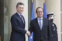 French President François Hollande sent a telegram to Macri and expressed "We will have the opportunity at that time to deepen our dialogue and our bilateral relationship that is one of the densest known to the Latin American continent". Hollande also confirmed a state visit to Argentina in February 2016.[103] Upon congratulating President Macri on his victory in the 2015 election, President Hollande announced that he would visit Argentina in February 2016. During his state visit to Buenos Aires on 24–25 February 2016, Macri and Hollande signed 20 bilateral agreements.[104]