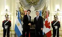 Obama and Macri discussed ways to strengthen cooperation in promoting "universal values and interests," such as in the areas of security, energy, health and human rights, where the two presidents have agreed for U.S. federal agencies to assist Argentina's counter-terrorism efforts, to contribute to peacekeeping missions, combat illegal drug trade and organized crime, respond to diseases and outbreaks like the Zika virus, and develop resources and renewable energy strategies.[87] Obama also praised Macri for his economic reforms that helped create "sustainable and inclusive economic growth" and "reconnected Argentina with the world economy."[88] Thus, Obama declared a "fresh era" of relations that would help Argentina's credibility in the Latin American region and the world, and announced trade and economic initiatives to reset the countries relations after years of tension.[89][90]