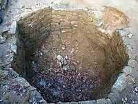 An archaeological excavation of the LBC's footprint was undertaken in November/December 2000.[1] The most significant President's House-related artifact uncovered was the bottom half of its icehouse pit.[17] A technological marvel built by Robert Morris in the early 1780s, the icehouse had been a windowless building erected over an octagonal stone-walled pit, 13 ft (4.0 m) in diameter and 18 ft (5.5 m) deep.[18]: 46–53 In midwinter the pit would be packed with blocks of ice harvested from the Schuylkill River.[19] The icehouse provided refrigeration for most of the year: