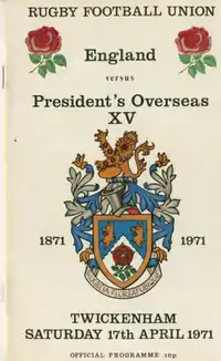 England v President's Overseas XV was a 1971 rugby union match between England and a President's Overseas XV. The match was played to celebrate the centenary of the Rugby Football Union. [1] The President's Overseas XV featured players from Australia, Fiji, France, New Zealand and South Africa and was effectively a World XV. The President's Overseas XV won 28-11.