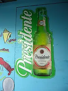 Presidente is a brand of Pilsner beer that is owned and produced by Cervecería Nacional Dominicana (CND) at several breweries in the Dominican Republic.[1] In addition to domestic consumption in the Dominican Republic, Presidente is exported to the United States, Panama, Honduras, Spain, Germany, Switzerland, Italy, Andorra, Aruba, Cuba, Curaçao, Antigua, Belize, Martinique, Guadeloupe, Turks and Caicos, The Bahamas, Saint Martin, British Virgin Islands and Puerto Rico.[2] Varieties include Presidente (5.0% ABV) and Presidente Light (4.3 ABV.)[3]