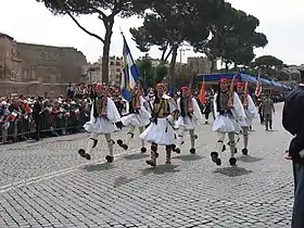 The Presidential Guard is a purely ceremonial unit, charged with providing permanent ceremonial guard detachments of two Evzones each for the Tomb of the Unknown Soldier and the entrance to the Presidential Mansion, and one Evzone for its own barracks, the Georgios Tzavellas Camp, situated directly in front of the Presidential Mansion.[6] It also provides personnel for the solemn raising and lowering of the Greek flag on the Acropolis of Athens, honour guards during foreign head of state visits, and participation in military parades both inside and outside Greece, most notably during the Greek Independence Day celebrations on 25 March in New York and Chicago.[7] Detachments of the Guard have also occasionally participated in Greek Independence Day celebrations in Melbourne, Philadelphia, and elsewhere.