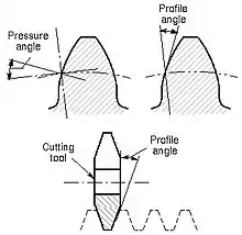 Just as there are three types of profile angle, there are three types of corresponding pressure angle: the transverse pressure angle, the normal pressure angle, and the axial pressure angle.[4]