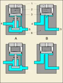 Both types of regulator use feedback of the regulated pressure as input to the control mechanism, and are commonly actuated by a spring loaded diaphragm or piston reacting to changes in the feedback pressure to control the valve opening, and in both cases the valve should be opened only enough to maintain the set regulated pressure. The actual mechanism may be very similar in all respects except the placing of the feedback pressure tap.[2] As in other feedback control mechanisms, the level of damping is important to achieve a balance between fast response to a change in the measured pressure, and stability of output. Insufficient damping may lead to hunting oscillation of the controlled pressure, while excessive friction of moving parts may cause hysteresis.