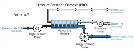 PRO uses a water–permeable membrane with an osmotic pressure difference to drive water flux from a low–concentration (LC) "diluate" stream, to a be drawn into a slightly pressurized higher–concentration (HC). An energy recovery device on this stream provides the energy output, and must exceed the pumping pressure input for net power production.