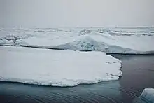 The blocks making up pressure ridges are mostly from the thinner ice floe involved in the interaction, but it can also include pieces from the other floe if it is not too thick.[1] In the summer, the ridge can undergo a significant amount of weathering, which turns it into a smooth hill. During this process, the ice loses its salinity (as a result of brine drainage and meltwater flushing). This is known as an aged ridge.[8]A fully consolidated ridge is one whose base has undergone complete freezing.[8] The term consolidated layer is used to designate freezing up of the rubble just below the water line.[2] The existence of a consolidated layer depends on air temperature — in this layer, the water between individual blocks is frozen, with a resulting reduction in porosity and an increase in mechanical strength. A keel's depth of an ice ridge is much higher than its sail's height - typically about 3-5 times. The keel is also 2-3 times wider than the sail.[9] Ridges are usually melting faster than level ice, both at the surface[10] and at the bottom.[11] Sea-ice ridges also play an important role in confining meltwater within under-ice meltwater layers, which may lead to the formation of false bottoms.[12]