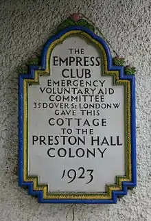 During World War I the hall was used as a hospital and convalescent home for servicemen wounded in the war. It built a particular reputation for the treatment of tuberculosis (TB).[9][10][11][12] After the war the site was purchased to establish a sanatorium, training colony and village for wounded servicemen and to act as a centre for the treatment of TB. The estate became known as the Preston Hall Colony.[9][13]