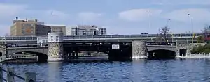 The Pretoria Bridge is a table-lift bridge in Ottawa, Ontario, Canada. It crosses the Rideau Canal linking the Glebe and Centretown to Old Ottawa East. The bridge was built in 1915, replacing an earlier wooden swing bridge on Argyle Street just to the north. It is a vertical-lift bridge, meaning that the central portion of the bridge can be elevated to allow boats to pass underneath. Although built by the Strauss Bascule Bridge Company, the lift span is not a bascule type but a lift-type.[1]
