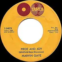 "Pride and Joy" is a 1963 single by Marvin Gaye,[1] released on the Tamla label. The single, co-written by William "Mickey" Stevenson, Gaye and Norman Whitfield, and produced by Stevenson, was considered to be a tribute to Gaye's then-girlfriend, Anna Gordy.[2] The album version of the single featured on Gaye's second album, That Stubborn Kinda Fellow is different in parts to the single version presenting a more jazz effect than the gospel-emulated version that became a single. The song was also Gaye's first top ten pop single peaking at number ten on the chart and just missed the top spot of the R&B singles chart peaking at number two. The song also helped continue Gaye's successful hit streak as the singer would score another Top 40 pop hit at the end of that year with "Can I Get a Witness".