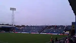 The ground underwent its most extensive redevelopment to date in 1955, at a total cost of £28,500. The previously sloping pitch was levelled, the terracing that occupied part of the Gordon Road side of the ground replaced, and new covered accommodation, known as the Stanley Stand, erected between the Rainham End and Gordon Road Stand.[14] The first floodlights were erected in 1963, at a cost of over £14,000, but this was to be the last significant development work at Priestfield for over thirty years.[15][16] By the early 1980s the capacity of the ground was listed as 22,000,[17] although this was reduced to 19,000 when the Gordon Road Stand was closed for safety reasons.[9][18] In 1987, a clock was erected at the corner of the Rainham End and the Stanley Stand, dubbed the Lord Sondes Clock in honour of Henry Milles-Lade, 5th Earl Sondes, a member of the club's board of directors. The clock was removed during later stadium redevelopment work.[19]