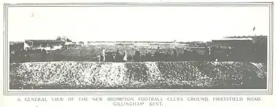 New Brompton Football Club, the forerunner of Gillingham Football Club, formed in June 1893. At the same time an area of land in Gillingham was acquired by the club's founders, the purchase being funded through an issue of 1,500 £1 shares.[2] The stadium was initially referred to simply as the Athletic Ground and subsequently named Priestfield Road until 1947, after one of roads leading to it.[3] A pitch was laid and a pavilion erected,[4] and the first matches at Priestfield were staged on 2 September 1893. New Brompton's reserve team played Grays, followed immediately by the first match for the club's first team, against Woolwich Arsenal's reserves. The admission charge for the two matches was 3d.[5] A newspaper report on the matches noted that the club had recently purchased an additional acre and three-quarters of ground and had accepted a contract for the construction of a stand containing 500 seats.[6] Most spectators stood on terracing, banked earth, or simply along the perimeter of the pitch, as was the case at most football grounds at the time.[7] In order to raise funds to assist with the running of the football club, New Brompton allowed the ground to be used for other events, such as smoking concerts, fêtes, athletics meetings and a ladies' football match. Sheep were allowed to graze on the pitch during the week, a common practice at many grounds at that time.[8] In 1899, a second stand was added along part of the Gordon Road side of the ground, reportedly built by off-duty dock workers in exchange for beer and cigarettes.[9]