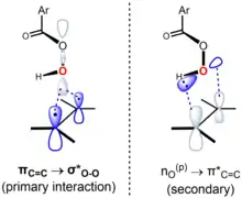 The reaction is believed to be concerted, with a transition state that is synchronous or nearly so.[6] The "butterfly mechanism" takes place via a transition state geometry in which the plane of the peracid bisects that of the alkene, with the O–O bond aligned perpendicular to it. This conformation allows the key frontier orbital interactions to occur. The primary interaction of the occupied πC=C orbital (HOMO) and the low-lying unoccupied σ*O-O orbital (LUMO). This interaction accounts for the observed overall nucleophilic character and electrophilic character of the alkene and peracid, respectively. There is also a secondary interaction between a lone pair orbital perpendicular to the plane of the peracid, nO(p) (HOMO) and the unoccupied π*C=C orbital (LUMO).[7][8] Using the approach of Anslyn and Dougherty (2006, p. 556), the mechanism can be represented as follows:[9]