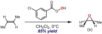 An illustrative example is the epoxidation of trans-2-butene with m-CPBA to give trans-2,3-epoxybutane:[4]