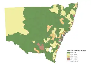 Primary Care Service Areas are geographic areas that are self-sufficient markets of primary care. These areas are designed in a manner such that the majority of patients living in these areas use primary care services form within the area. This ensures that any geographic targeting of policies and resources reach the patients they are meant for. These geographies have been created in Australia,[1] United States [2] and Switzerland [3] using big data and Geographic information systems. In Australia,[4] while they have been developed for the state of New South Wales, they have not found application among policymakers, where, as of 2016 much larger geographies called Primary Health Networks are used for primary care management. However, they have found an especially wide audience amongst policymakers and researchers in the United States,[5] where they were first developed. Thus for example the Health Resources and Services Administration uses them to designate areas of workforce shortage. Primary Care Service Areas are thus for example an appropriate geography for measuring primary care physician supply or geographic access to General practitioners.