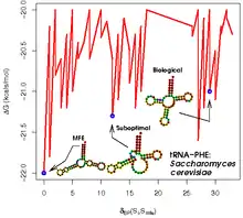 22. Zuker M, Sankoff D (1984). "RNA secondary structures and their prediction". Bull. Math. Biol. 46 (4): 591–621. doi:10.1007/BF02459506. S2CID 189885784.