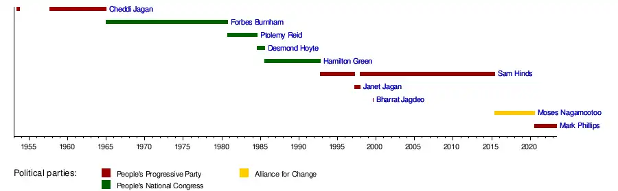 23 February 1970 | 6 October 1980 | 10 years, 226 days | People's National Congress | Luckhoo Chung | |