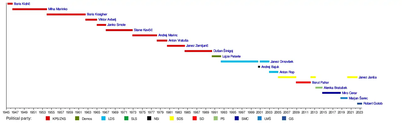 The prime minister of Slovenia, officially the president of the Government of the Republic of Slovenia (Slovene: Predsednik Vlade Republike Slovenije), is the head of the Government of the Republic of Slovenia. There have been nine officeholders since the country gained parliamentary democracy in 1989 and independence in 1991.